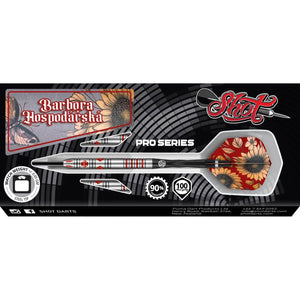 This Shot Pro Series dart set has been co-designed for PDC's Women's series player Barbora Hospodarska. Looking for a grit-free grip? With the subtle texture of rolling rings, this barrel rewards with a softer yet precise grip. Let your point finger land on the back of a streamlined nose with finely milled bands or within the petalled indentations of milled Czech sunflowers. This one will see you through the most intense tournament or long practice hours.