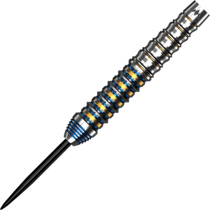 This dart includes a section of radial grooves towards the rear of the barrel, complete with a gold PVD coating, and a small smooth section with the laser-etched Mission logo. The front section of the barrel includes a more intense grip with grooves thatis complete with a blue and gold PVD coating. The front of the barrel has a small section of ring grip with blue painted rings that leads to a smooth black point.