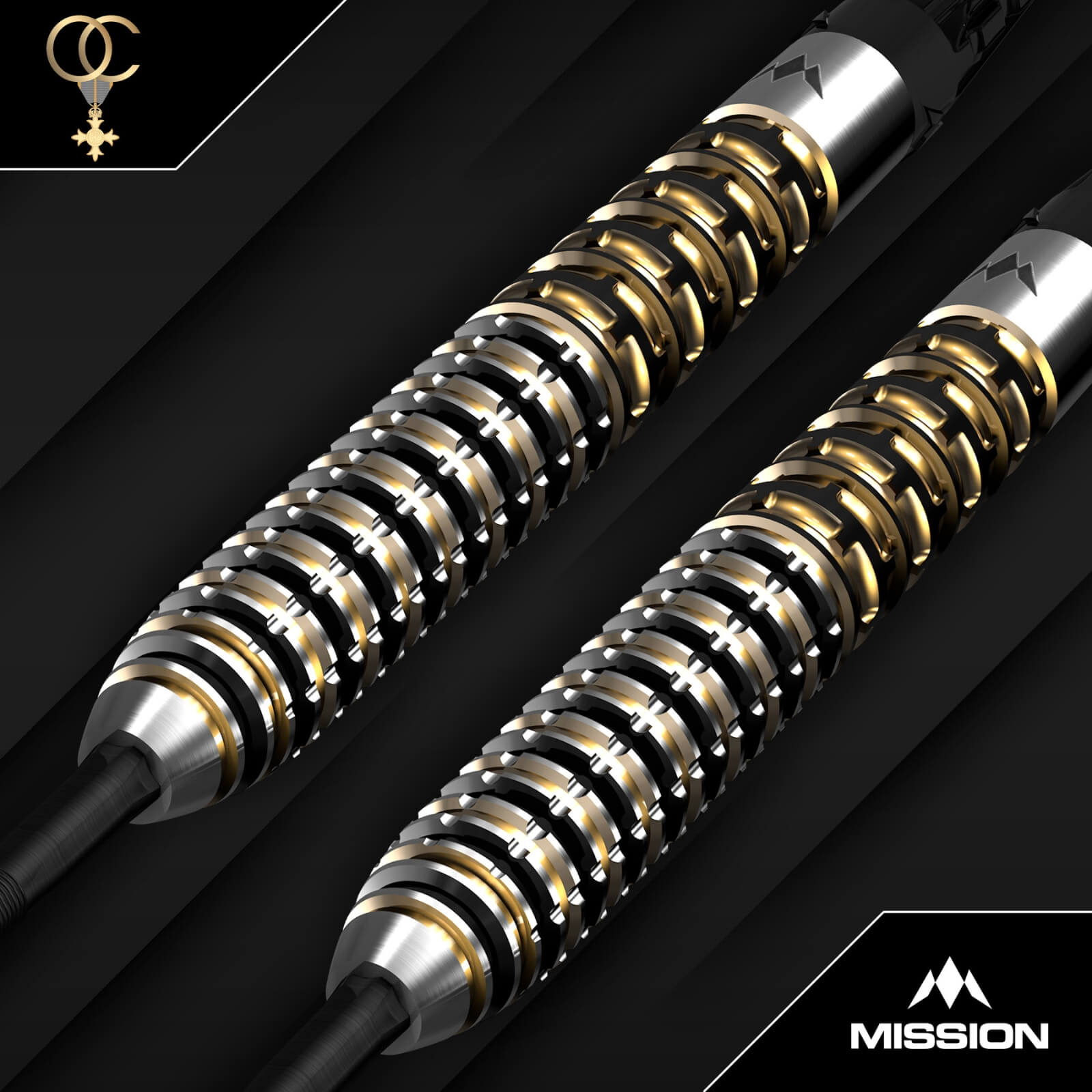 The Olly Croft limited edition darts are made from a premium 95% tungsten material, with various milling and grooves along the barrels and highlighted by a beautiful gold and black PVD coating. These darts come already fitted with the Mission Caliburn replaceable point system and Mission Force 90 Vortex transparent black flights.